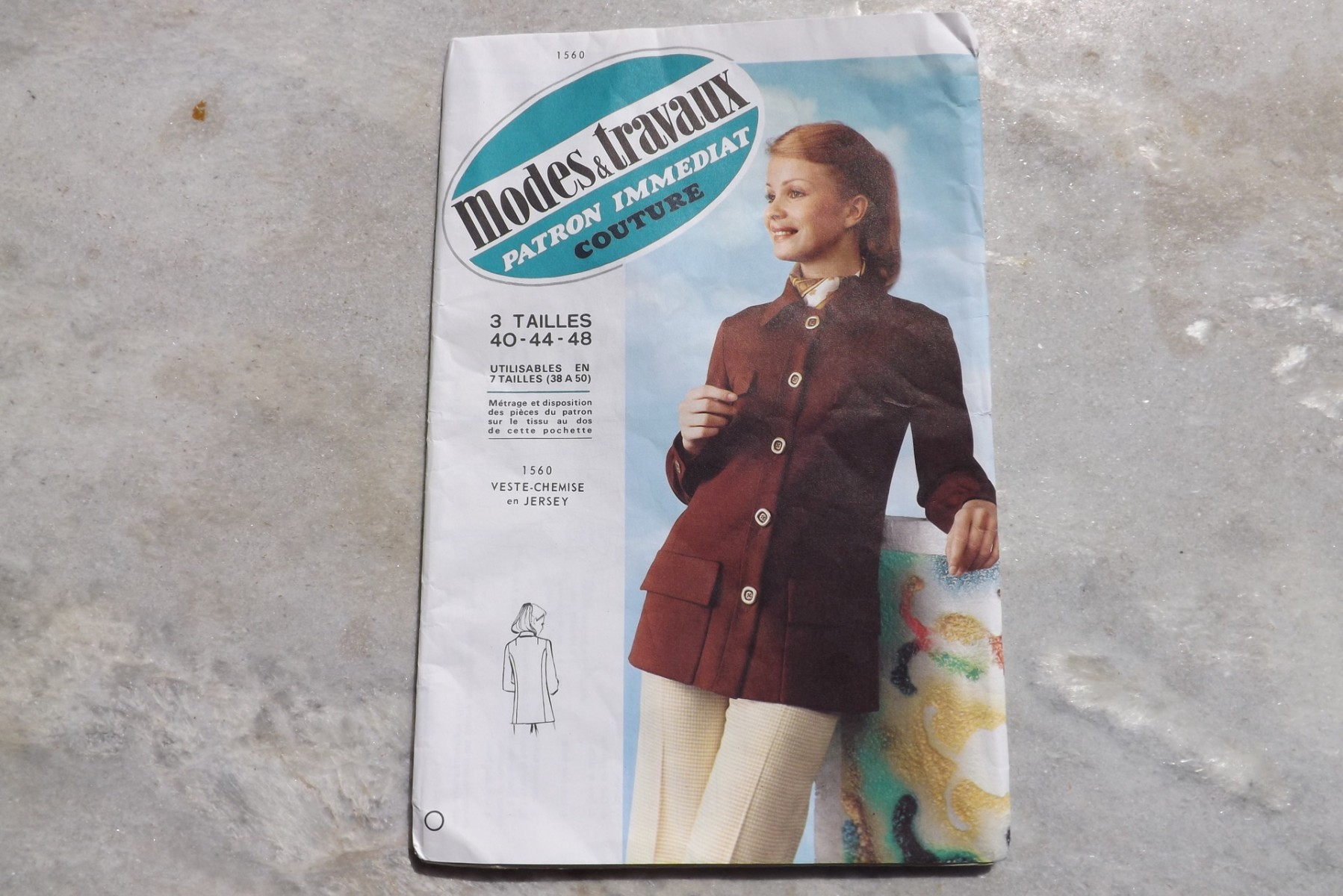 Ce patron est en papier, il n'a pas été utilisé; il vous suffit de découper le long du trait qui correspond à votre taille et vous obtenez toutes les pièces de cette veste. Modèle classique indémodable. En jersey ou toile ou lainage, la matière choisie lui donnera son look. Manches longues avec poignets, col chemise, patte de boutonnage, poches plaquées avec rabats au bas de la veste et sur la poitrine, découpes devant et dos qui lui donnent une forme légèrement cintrée. Le plan de coupe est au dos de la pochette et les explications et croquis d'assemblage à l'intérieur.