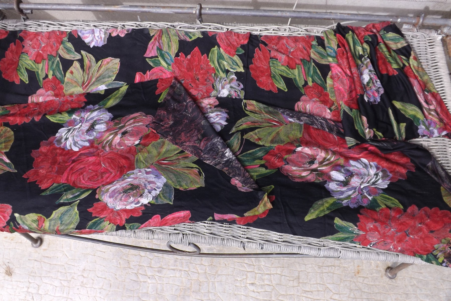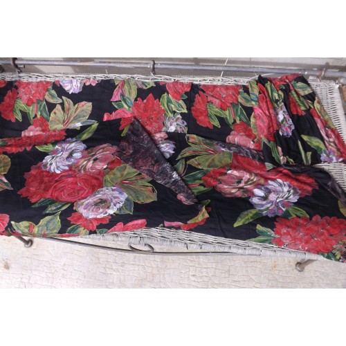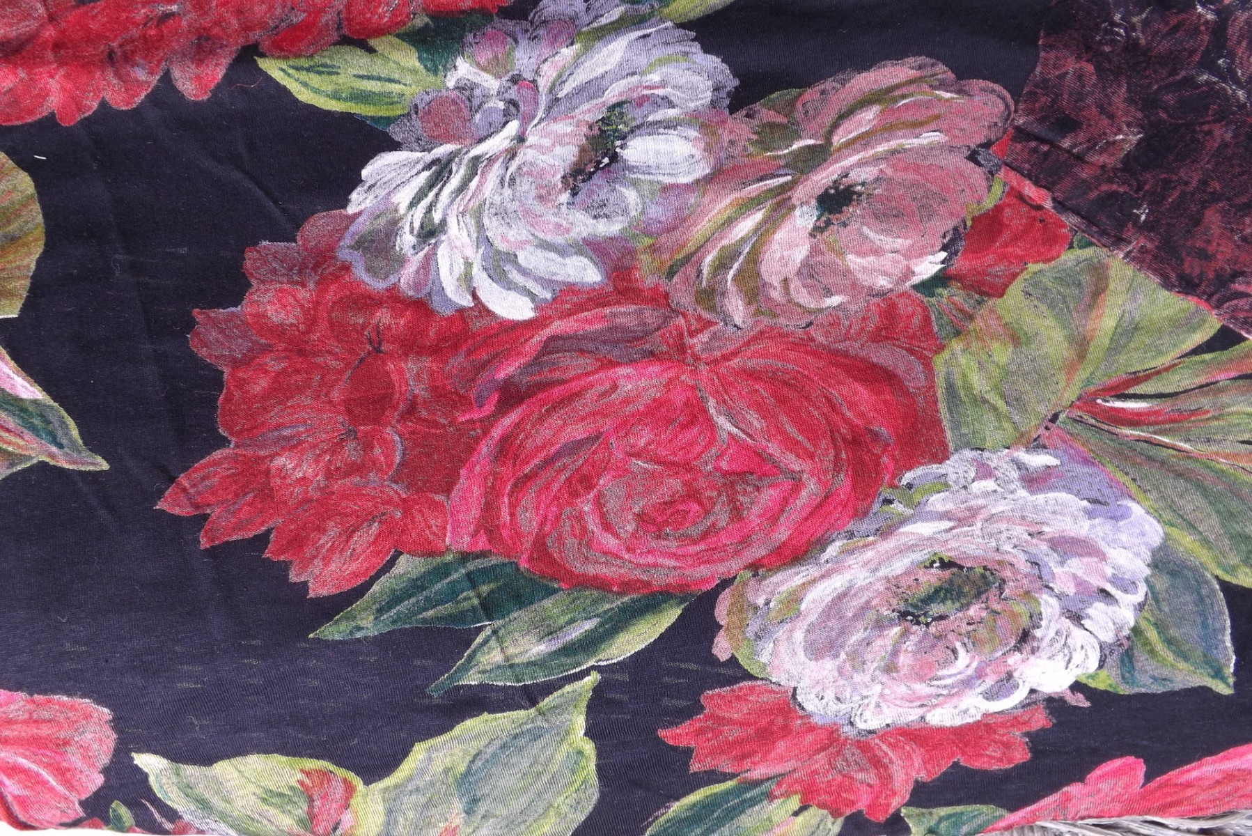 Ce tissu est une chute qui reste d'une de mes créations. Jersey coton et viscose assez fin mais non transparent, aspect mat. Toucher très doux. Le tomber est fluide et lourd donné par la viscose. Tissu de qualité, ne déteint pas. Lavage 30°. Repassage sur laine. Imprimé grosses roses rouges bordeaux, du blanc, mauve, feuilles vert kaki et bouteille. Dimensions: le plus grand morceau allongé fait 1m50 sur 26cm sur toute sa longueur, 2eme morceau 24cm x 56cm, 3eme morceau 29cm x 56cm. Dimension des roses 7cm x 12cm environ. Tissu un peu extensible. On peut faire un haut et un volant de mini jupe en ajoutant un jersey uni noir, du jean ou de la dentelle noirs par exemple. à vos ciseaux!