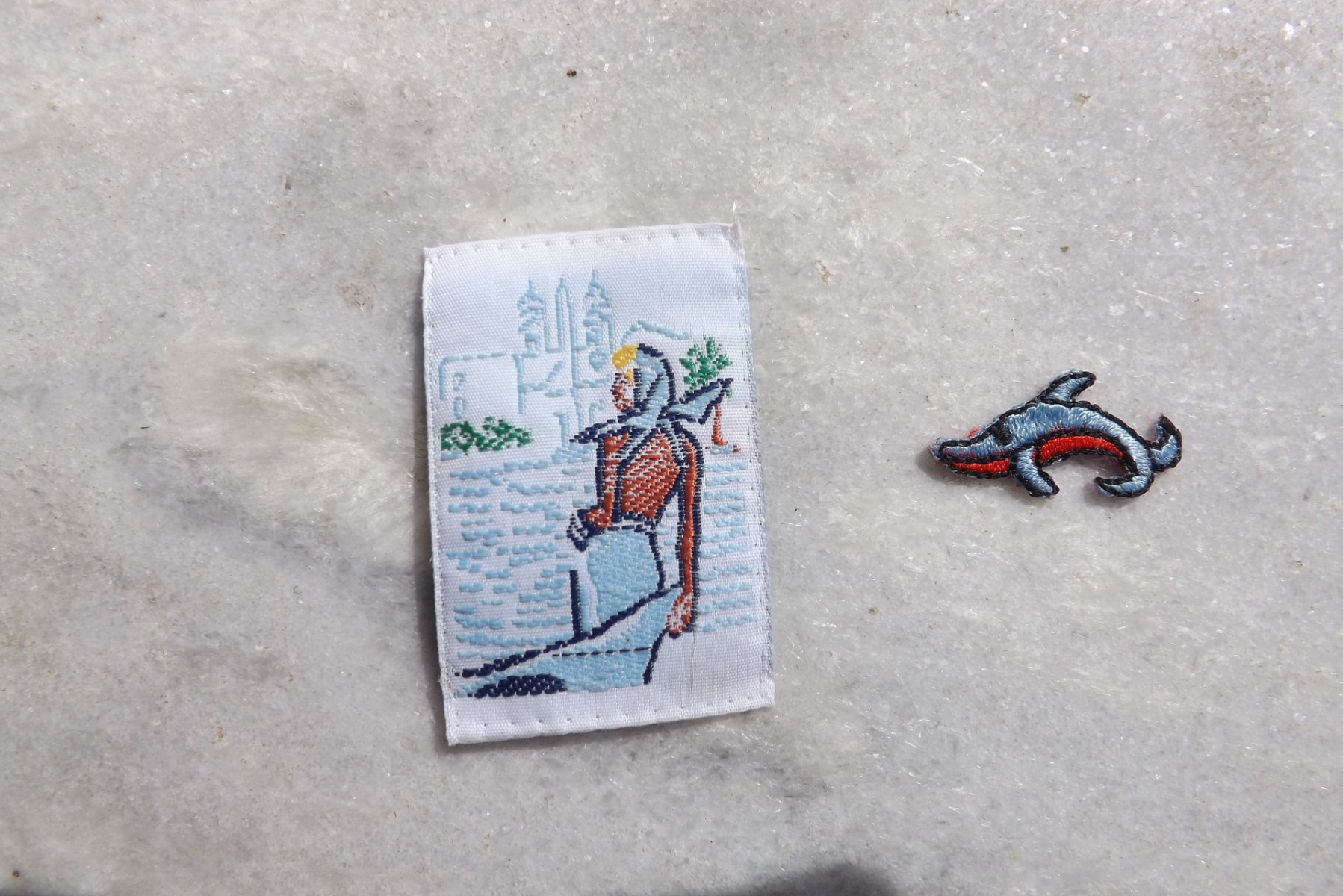 Une étiquette en tissu synthétique brodé machine représentant une femme vue de dos regardant un fleuve et sur l'autre berge une mosquée. Couleurs bleu ciel, ocre,arbre vert, fond blanc. Dimension haut 5cm x large 3,3cm. à coudre à la machine. Lavable.