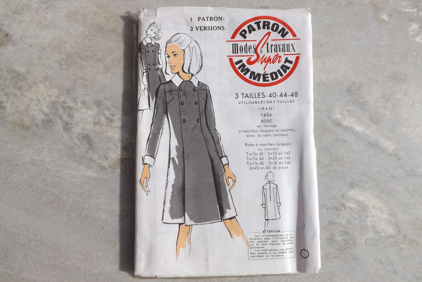 Ce patron est en papier, il n'a pas été utilisé; il vous suffit de découper le long du repère qui correspond à votre taille. Il y a 2 modèles de robe: manches courtes ou manches longues, et poches horizontales ou sans poches. Le plan de coupe est au dos de la pochette et les explications et croquis d'assemblage sont dans la pochette.Cette robe a une coupe impeccable. Col et poignets blancs, manches montées, belles découpes devant qui arrivent dans le plis plat. Pinces de poitrine, découpes dos, fermeture éclair milieu dos. Six boutons devant.