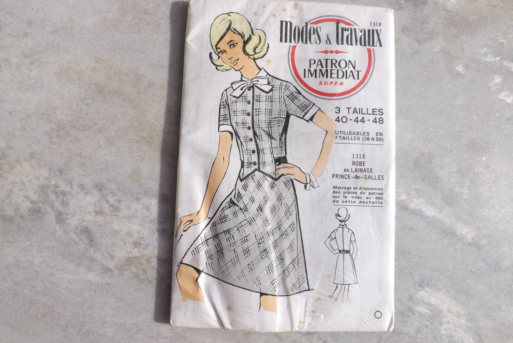 Ce patron est en papier, il n'a pas été utilisé, il vous suffit de découper sur le trait qui correspond à votre taille. Le plan de coupe et au dos de la pochette et la fiche technique à l'intérieur. Cette robe donne l'impression d'être en 2 pièces mais elle est en une seule pièce, il y a une fermeture éclair dans le dos. Le boutonnage devant est décoratif. Le haut a des manches courtes avec bordure blanche, pinces de poitrine, bande blanche pour l'encolure qui se noue. Ceinture en cuir vernis glissée devant dans les ouvertures. La jupe est coupée dans le biais, elle est évasée, couture milieu dos.