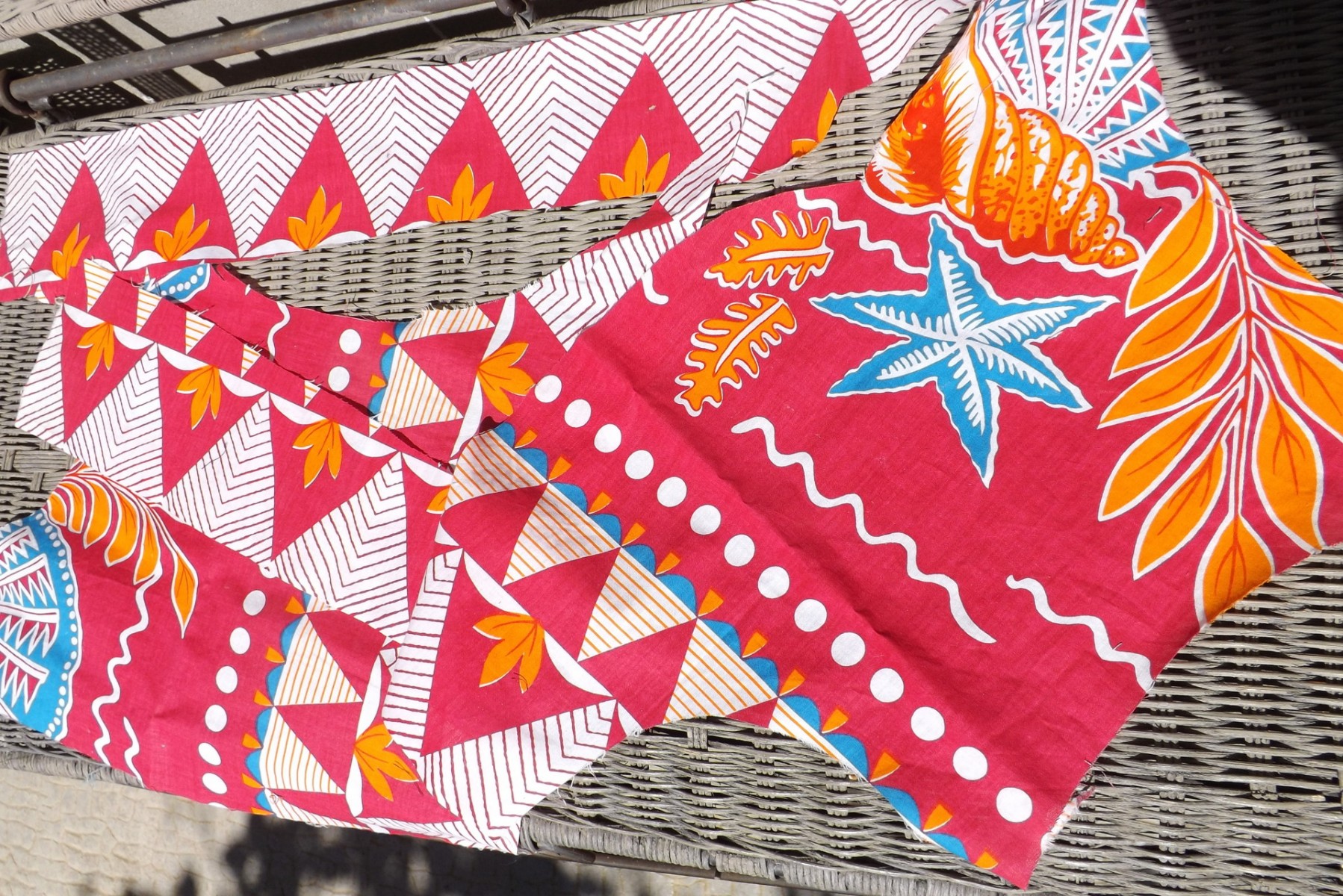 Ce lot se compose de 3 morceaux de coton assez grands: ce sont des chutes de précédentes créations et je les ai vraiment achetés à Tahiti. Le tissu n'a pas été lavé. Les couleurs sont résistantes. Dimensions: une bande 10cm x 60cm environ avec bel imprimé graphique en triangle et feuillages de l'arbre fruits à pain, 2eme morceau: 41cm x 31cm environ avec le même imprimé géométrique et un gros coquillage, un poisson, une grande feuille d'arbre. 3eme morceau: 43cm x 30cm environ plus sa partie en forme de bande qui dépasse qui fait 10cm x 48cm. Le motif étoile de mer couleur turquoise mesure 14cm. Vous pouvez utiliser ce tissu pour décorer des jeans ou autres vêtements, faire des bordures de poches, des empiècements de jupes ou bas de robes. Faire des pochettes, bijoux textiles, patchwork combiné à d'autres tissus. Envoyé dans une enveloppe kraft en lettre économique.