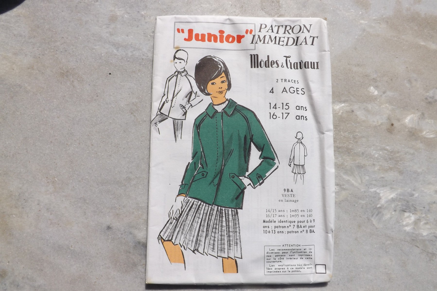 Cette veste a un petit col, des manches raglan, des poches inclinées décorées de pattes comme au bas des manches. La veste se ferme par des boutons cachés par une patte. Métrage: 1m85 de tissu en 140 de large pour la taille 14ans.