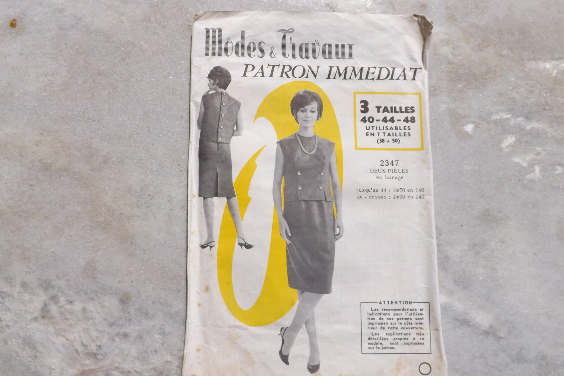 Ce patron est en papier, il a déjà été utilisé, il est découpé en taille 48, vous pouvez le réduire en découpant le long du trait qui correspond à la taille souhaitée. Le plan de coupe est au dos de la pochette et les explications à l'intérieur. La jupe droite est légèrement froncée devant, fermeture éclair milieu dos, plis pour l'aisance de la marche. Le haut est boutonné dans le dos, encolure ras du cou, découpes devant et petite fentes, forme assez droite, emmanchures qui recouvrent un peu le haut du bras. Tissu recommandé à l'époque: lainage, mais vous pouvez couper cet ensemble dans du lin ou du tissu synthétique.