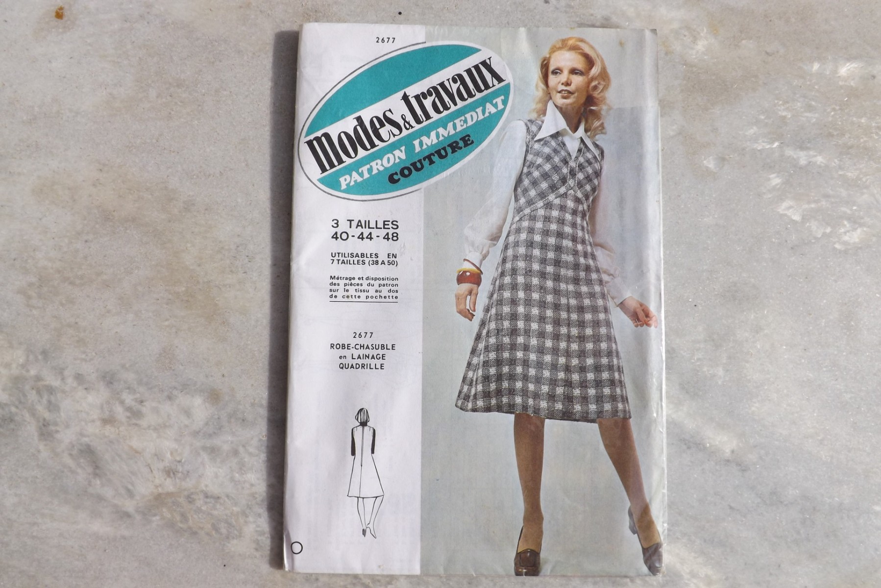 Ce patron est en papier, il n'a pas été utilisé; le plan de coupe est au dos de la pochette et la fiche technique à l'intérieur. Cette robe se porte sur un chemisier. Très belle coupe, la partie buste forme une pointe vers le plexus, pinces poitrine, encolure en v, emmanchures ajustées. Surpiqures qui donnent une finition parfaite. Fermeture éclair milieu dos. Jupe évasée qui arrive sous le genoux. à vos ciseaux!