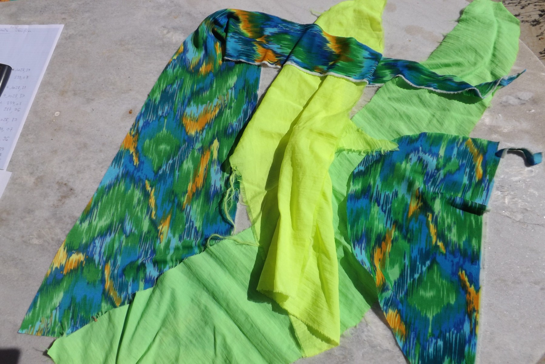 Cet assortiment se compose de 4 morceaux qui sont des chutes de mes créations. Le plus grand morceau de lycra imprimé vert, turquoise et jaune mesure 80cm x 24cm dans son extrémité la plus large, le second morceau dans le même tissu fait 34cm x 15cm, le nylon froissé vert fluo fait 12cm large x 77cm de long, le nylon froissé jaune fluo fait 24cm x 39cm. Lavables à 30°.