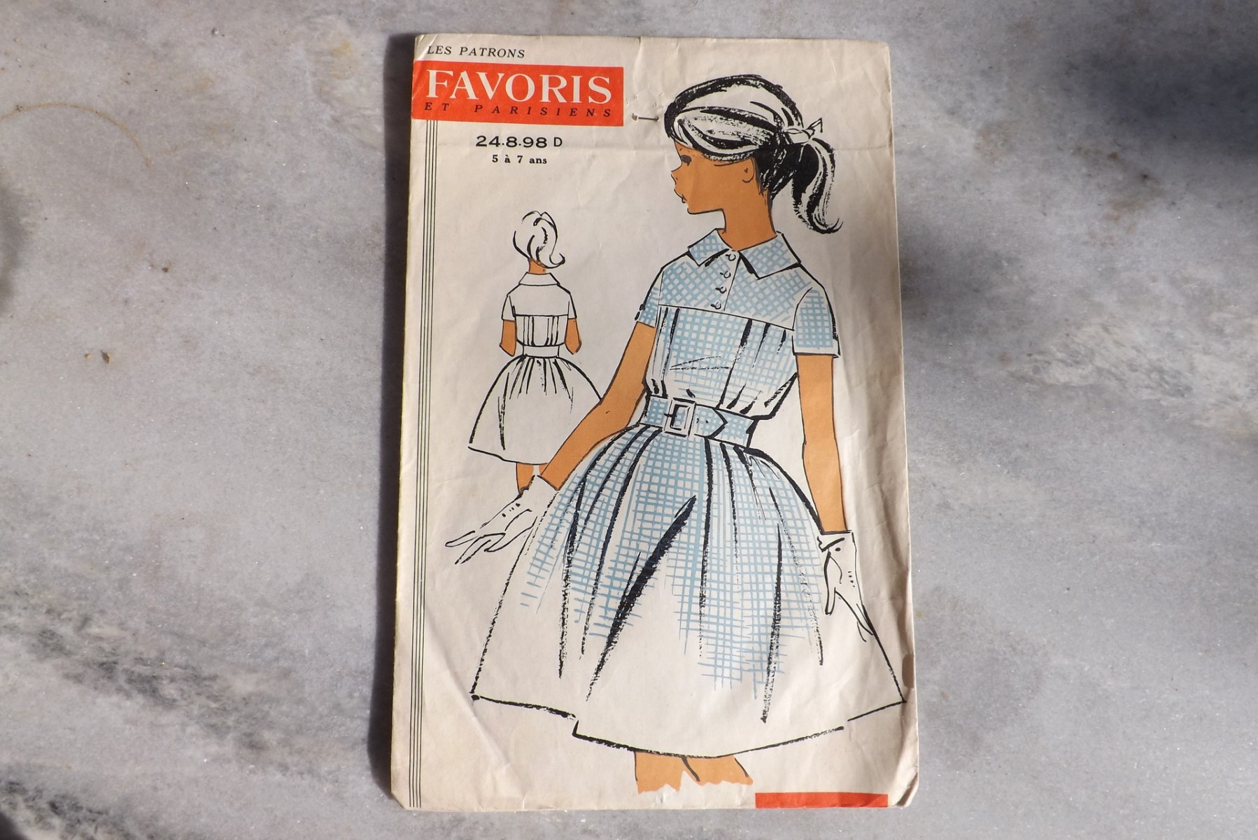 Ce patron est en papier de soie, il est découpé et prêt à l'emploi. Le plan de coupe se trouve au dos de la pochette avec des croquis d'assemblage et les explications. Des mesures vous permettent de vérifier la taille de l'enfant. La robe a un petit col posé sur un empiècement fermé par 4 boutons milieu devant. Manches courtes. Le bustier a un plissage devant et dos. Couture à la taille où ce plissage rejoint le plissage de la jupe. Une ceinture recouverte du même tissu marque la taille. La jupe évasée a une belle ampleur.