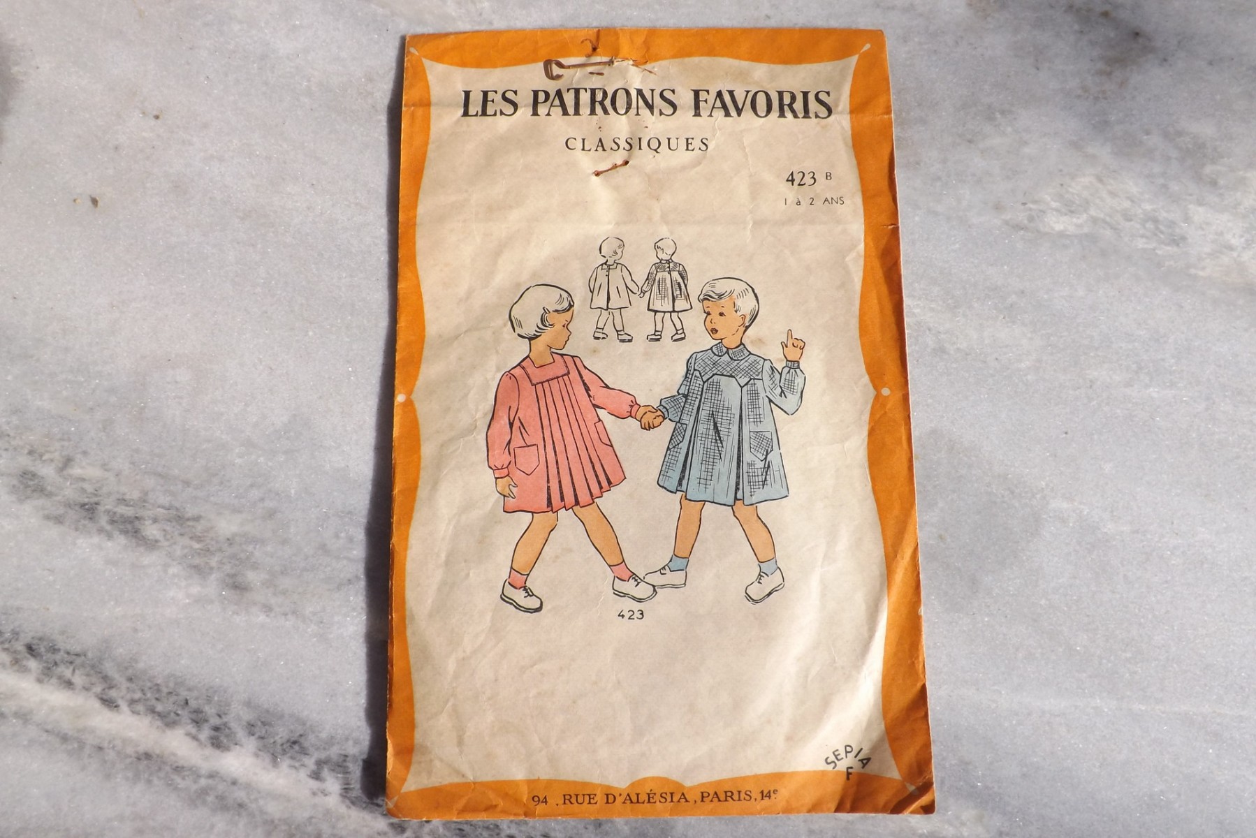 Ce patron est en papier de soie, il est déjà découpé. Le plan de coupe est au dos de la pochette ainsi que les explications et les croquis d'assemblage (c'est écrit assez petit, mon conseil est de photocopier et d'agrandir pour plus de confort). Deux petites robes adorables tailles de 1 an à 2 ans. La robe rose a un empiècement carré d'où partent 5 plis plats au milieu devant de la robe. Manches longues, poches plaquées, boutonnage dos. La robe bleu a un col Claudine, un empiècement qui forme 2 pointes devant d'où partent des plis creux. Envoyé dans une enveloppe kraft en mode économique.