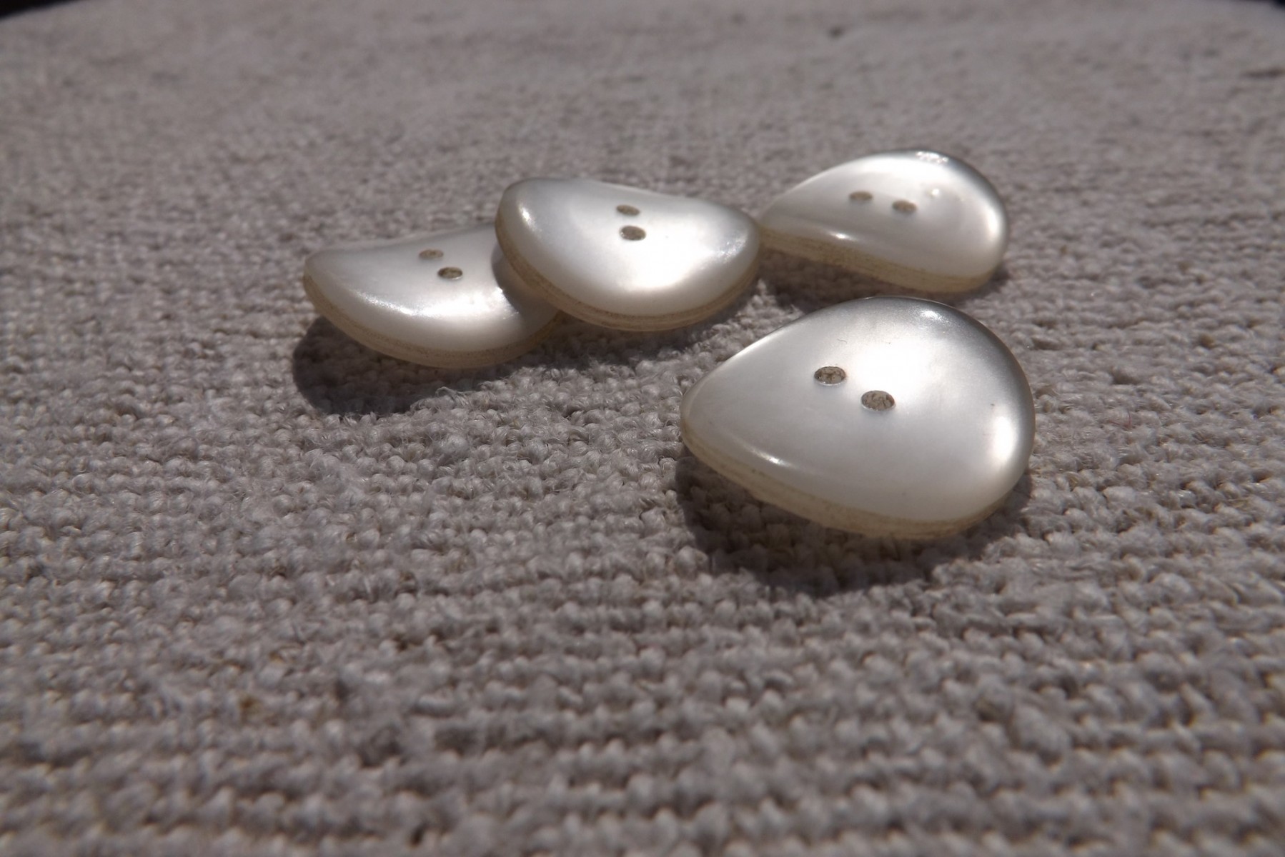 4 boutons en plastique en forme de pétales reflets nacrés blanc cassé écru, tous identiques. Avec 2 trous. Dimension: 2,1cm de diamètre. Les trous font un bon millimètre. épaisseur 1,5 millimètre. Occasion, en parfait état.