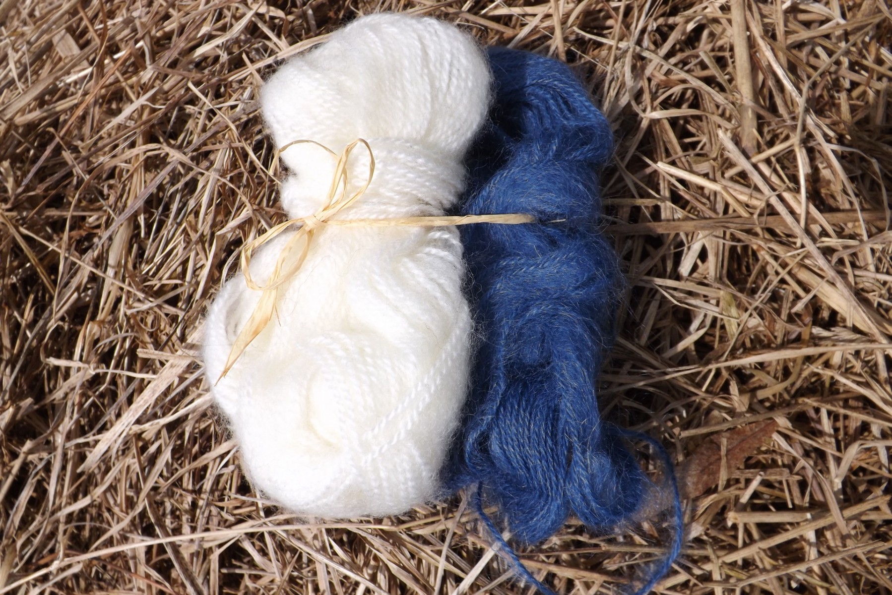 Deux pelotes entamées: il reste environ la moitié de chacune d'elles, soit 25gr de laine bleu et 25gr de laine écru. Elles ont la même épaisseur et qualité, l'aspect est mat, poilu, duveteux; épaisseur du fil 1mm et demi. Le bleu tire un peu vers le bleu pétrole. Je n'ai pas les étiquettes; je pense que cette laine est en acrylique mélangée. Chaque pelote fait 18cm de long et est épaisse de 2cm environ.