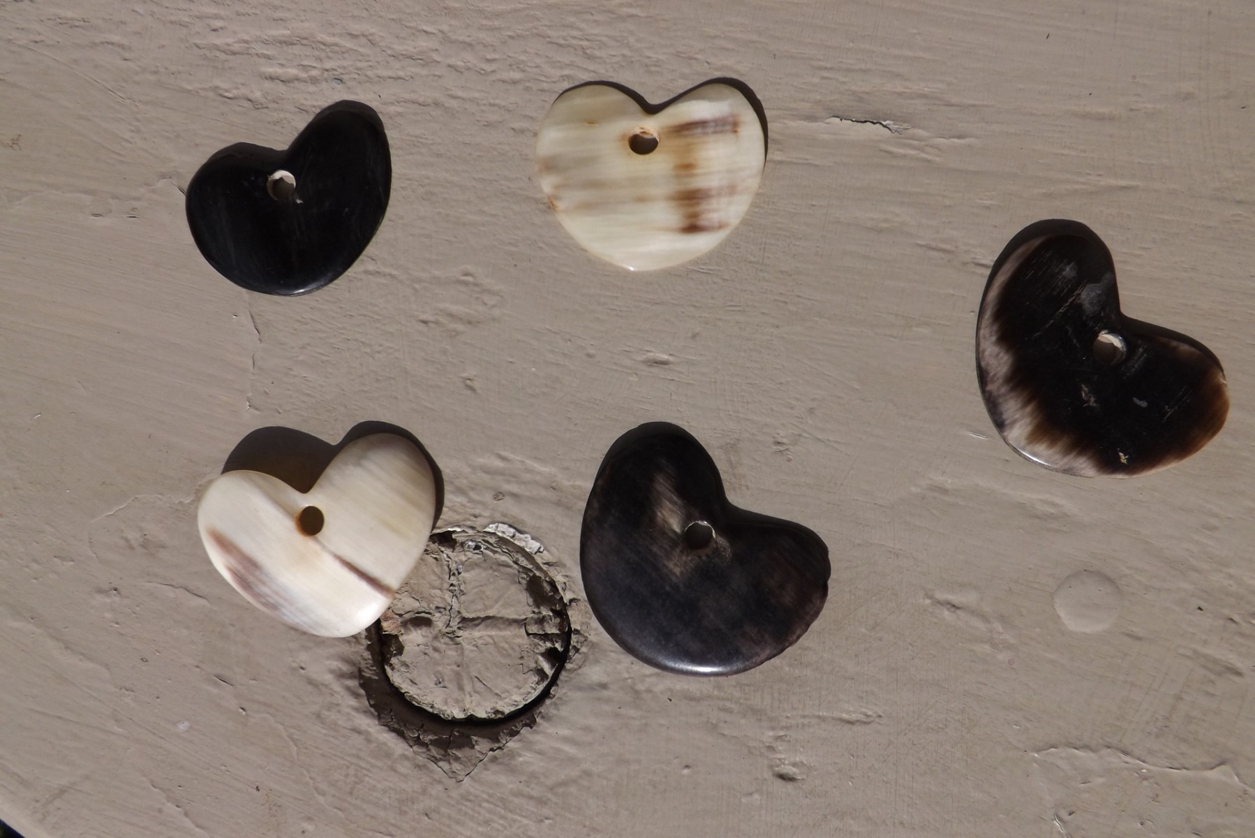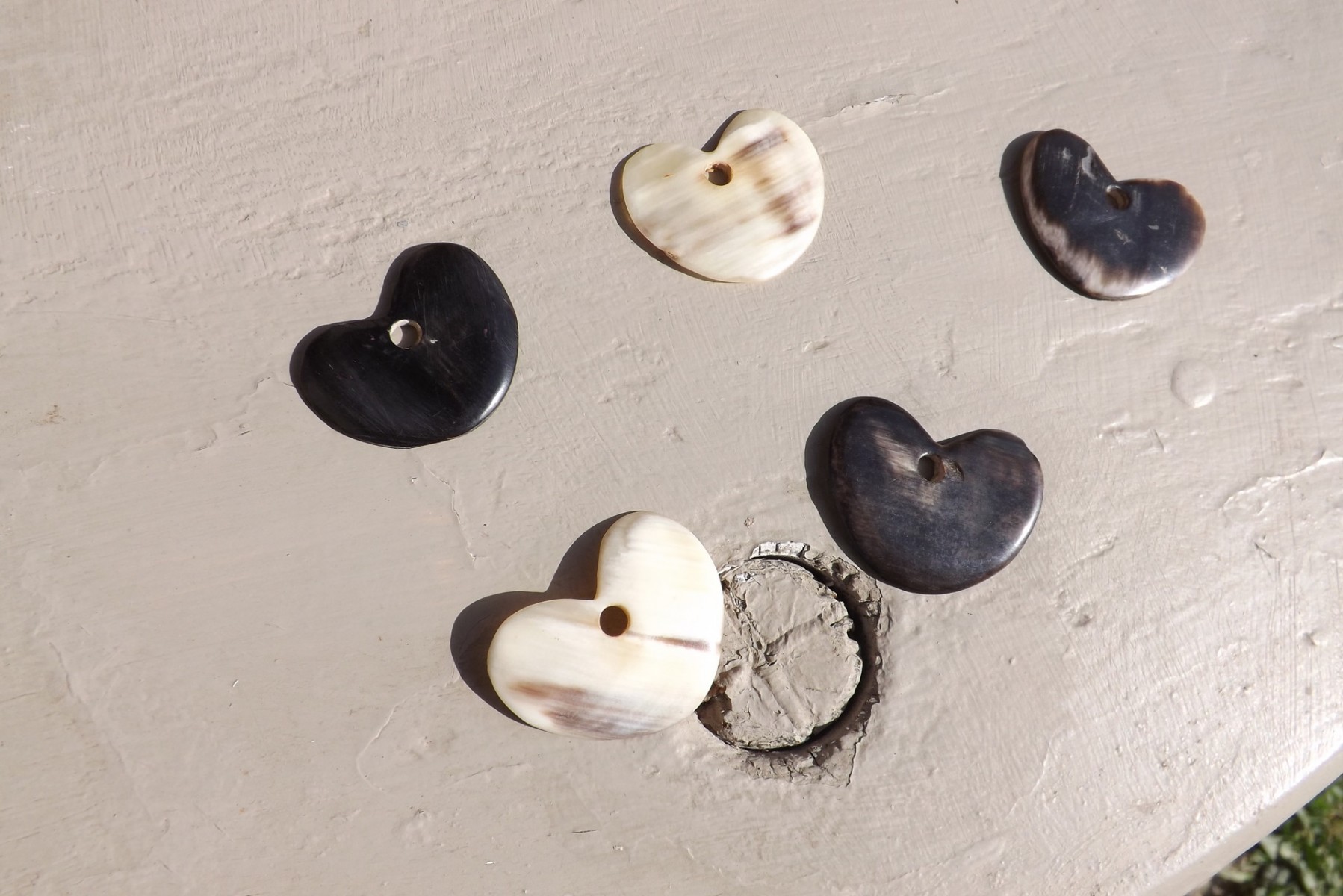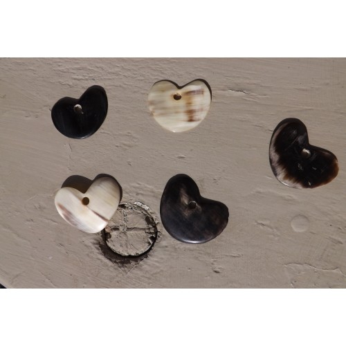 5 plaques artisanales en forme de coeur toutes différentes. En corne de zébu. 2 couleur crème striées d'un peu de beige et 3 couleur gris anthracite striées un peu gris plus clair. Il y a de légers défauts car fabriqués artisanalement; je les ai achetés à Madagascar lorsque je vivais à l'île de La Réunion. Dimension large 4cm haut 2,5cm pris au niveau du trou. Epaisseur 1mm. Le trou fait 5mm de diamètre. Aspect satiné. Chaque pendentif est léger comme un gros bouton de plastique. Poids de 5 coeurs: environ 30gr. Peuvent aller dans l'eau.