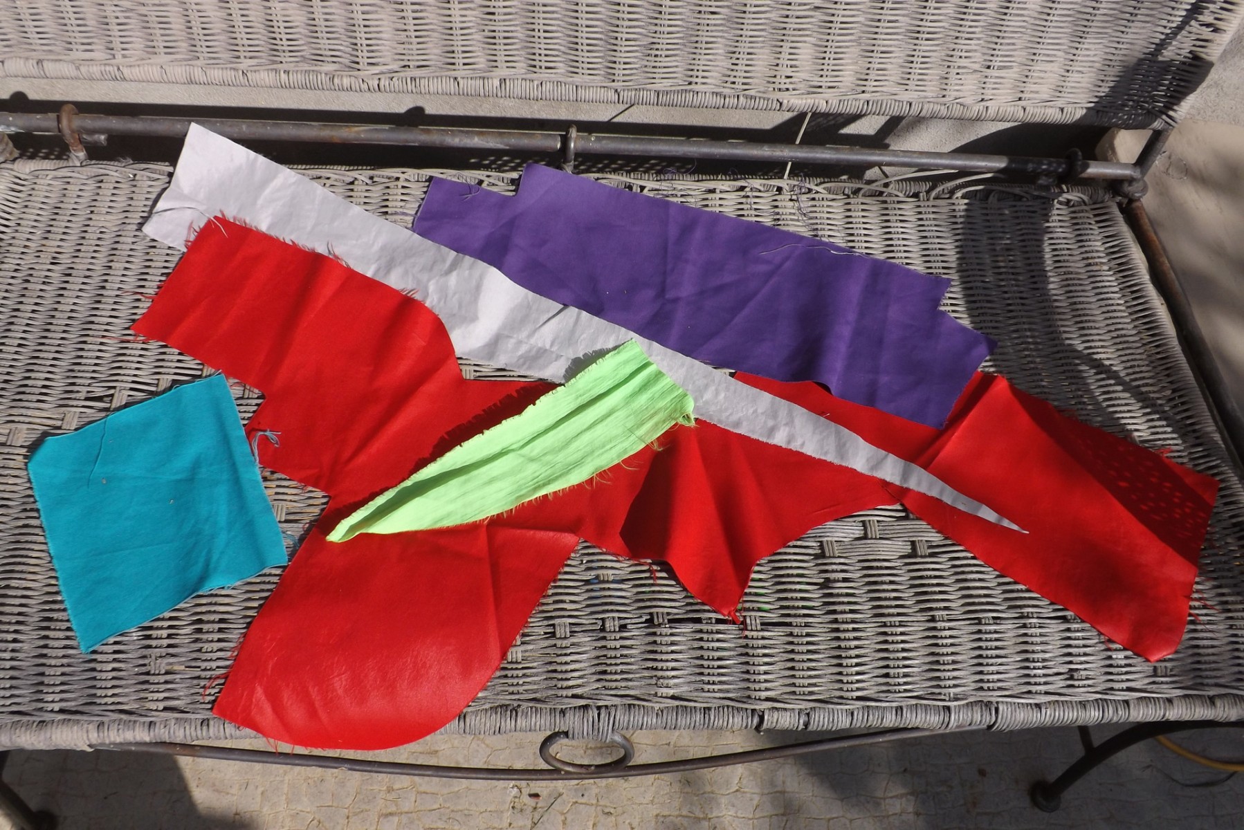 1 morceau de rouge qui a une forme biscornue car c'est une coupe avec des angles, il mesure environ 75cm de long et 27cm de haut, il est brillant d'un côté et mat de l'autre, c'est un beau rouge carmin, matière synthétique très solide et non extensible, épaisseur moins d'un millimètre. Une bande de gris clair même matière qui mesure 64cm de long et 10cm de large dans sa partie la plus large. Un morceau de violet uni, un côté mat, un côté brillant, synthétique solide aspect un peu peau de pêche non extensible même épaisseur que le rouge long 45cm large 13cm. Un morceau vert en toile de coton 15cm x 16cm. Un petit morceau de nylon froissé non extensible jaune fluo 7cm x 26cm forme en pointe.