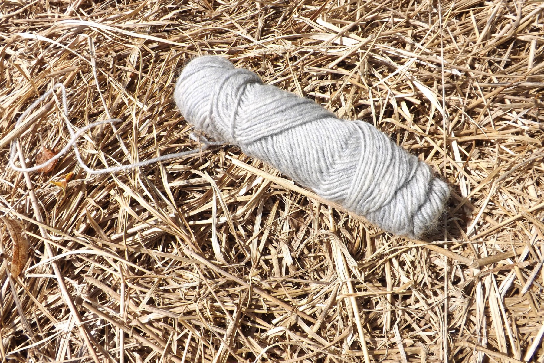 Une seule pelote de laine mélangée acrylique gris clair chiné. Il en reste environ 30 à 40 pour cent de la pelote,soit poids 30gr. Le fil fait 2mm, aspect mat, non extensible. Longueur de la pelote 17cm, épaisseur 4,5cm.