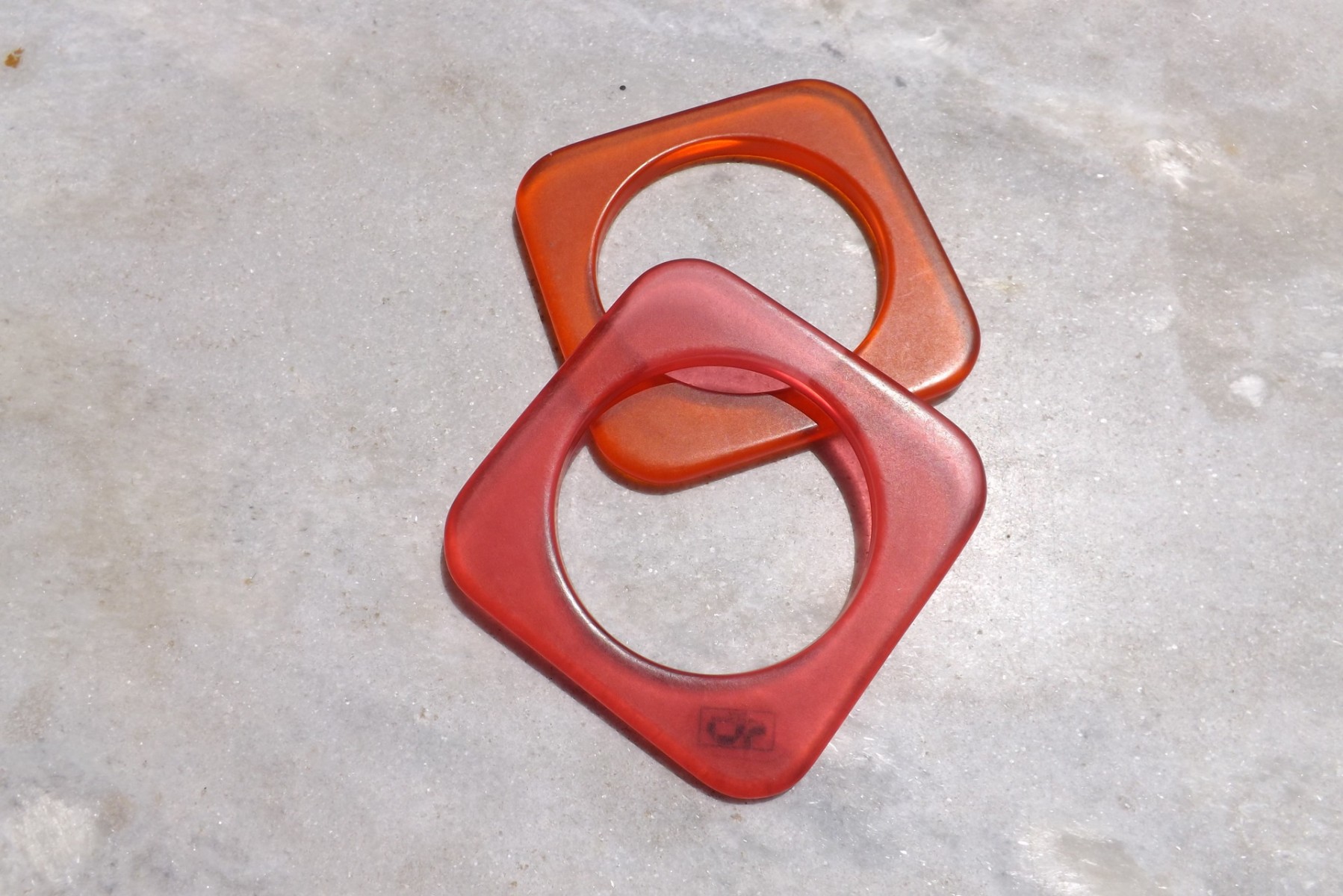 Deux gros anneaux en plastique dur: 1orange et 1 rouge, aspect mat. Forme carré à l'extérieur et rond à l'intérieur. Dimension: 8,8cm x 8,8cm pour le carré, diamètre intérieur 6,5, épaisseur 5mm.