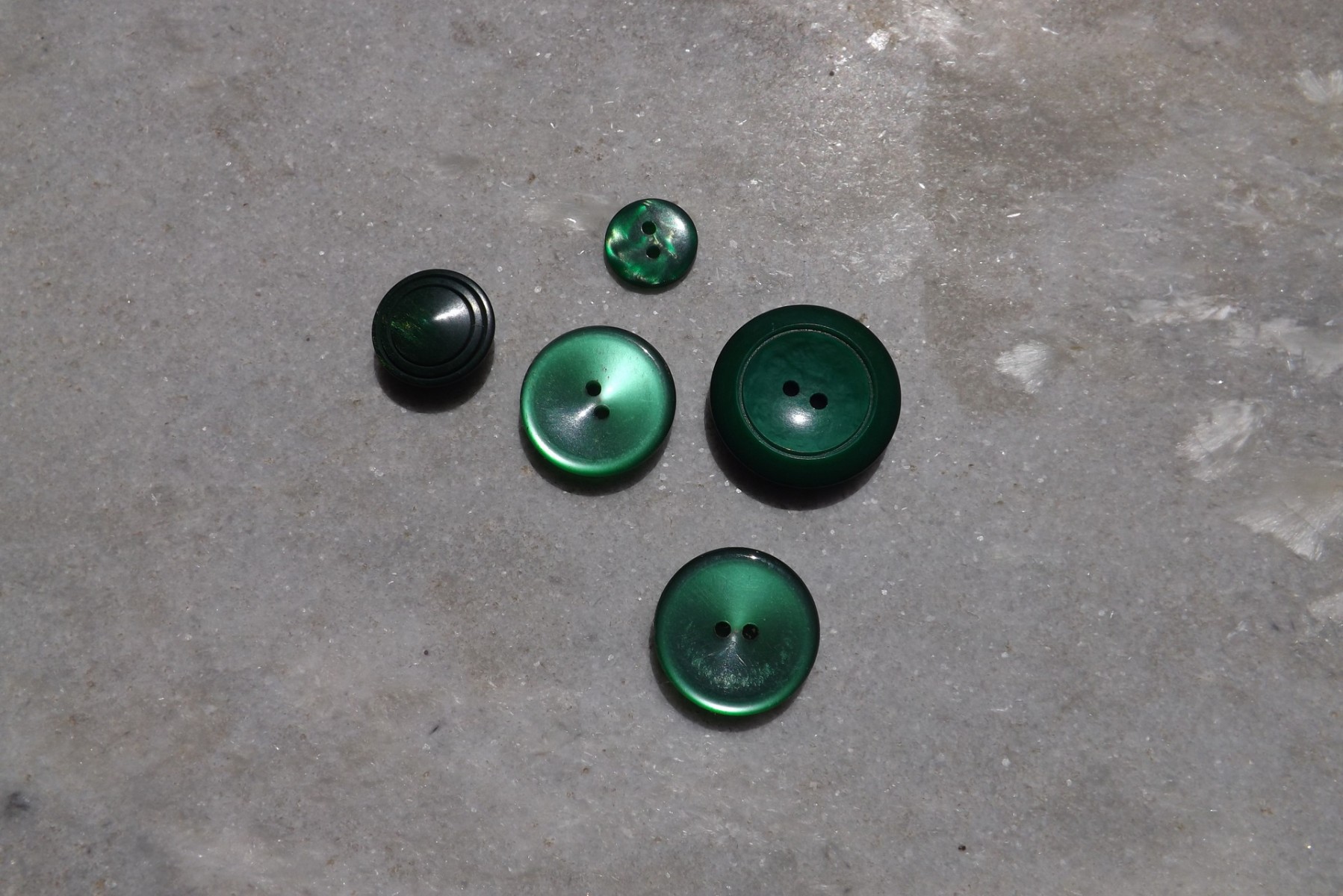 1 bouton vintage plastique vert aspect émeraude quand on le fait bouger il a des reflets; rond en forme bombé légèrement en pointe, le trou du bouton est invisible car sous le bouton, diamètre 1,8cm.