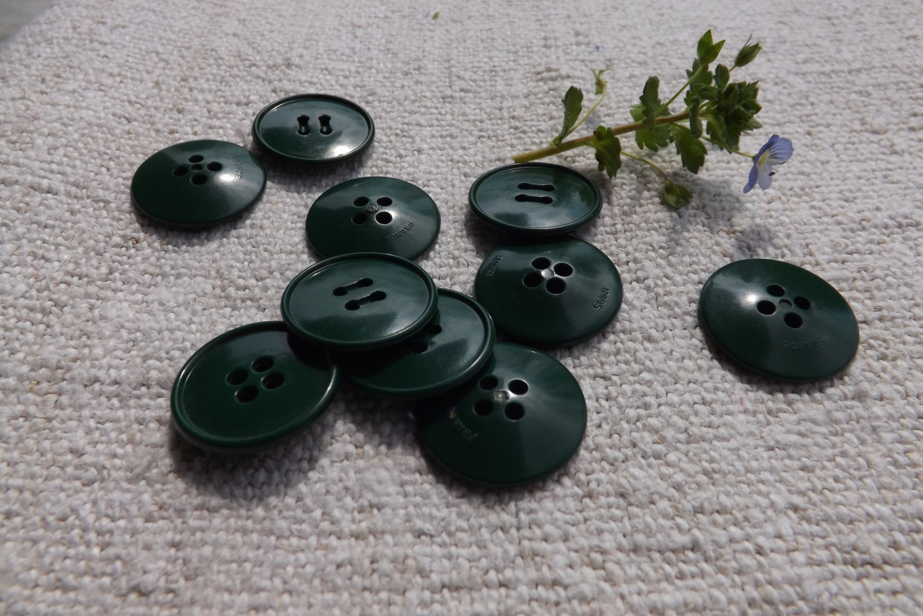 10 boutons en plastique vert bouteille uni satiné non transparents. Plats très sobres, un anneau circulaire de 1mm donne un léger relief, ils ont 4 trous. Diamètre 2,1cm, épaisseur au centre 2mm environ, diamètre des trous 2mm. Inscription France au dos.